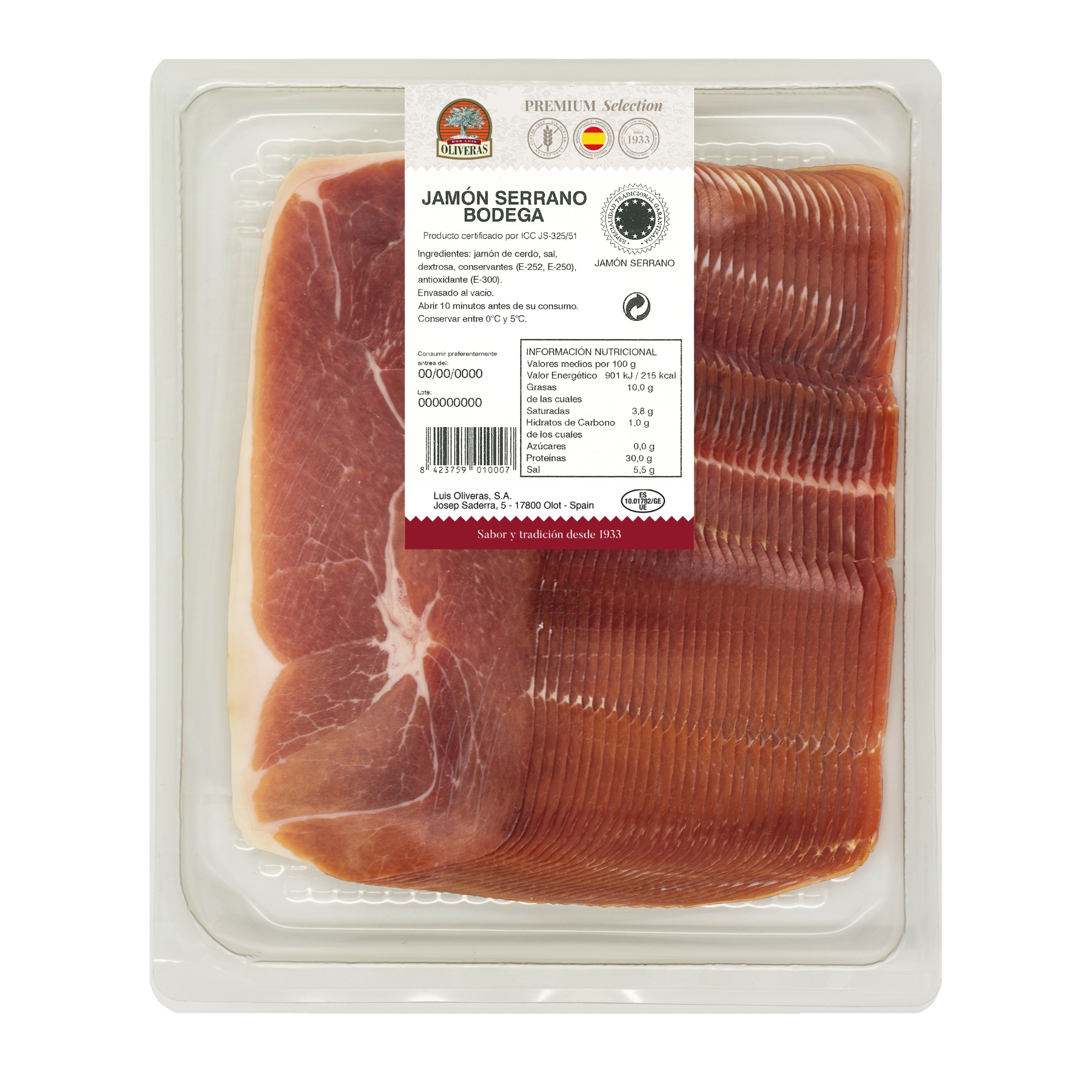 Vitināts cūkgaļas šķiņķis Jamon Serrano. Sagriezts.